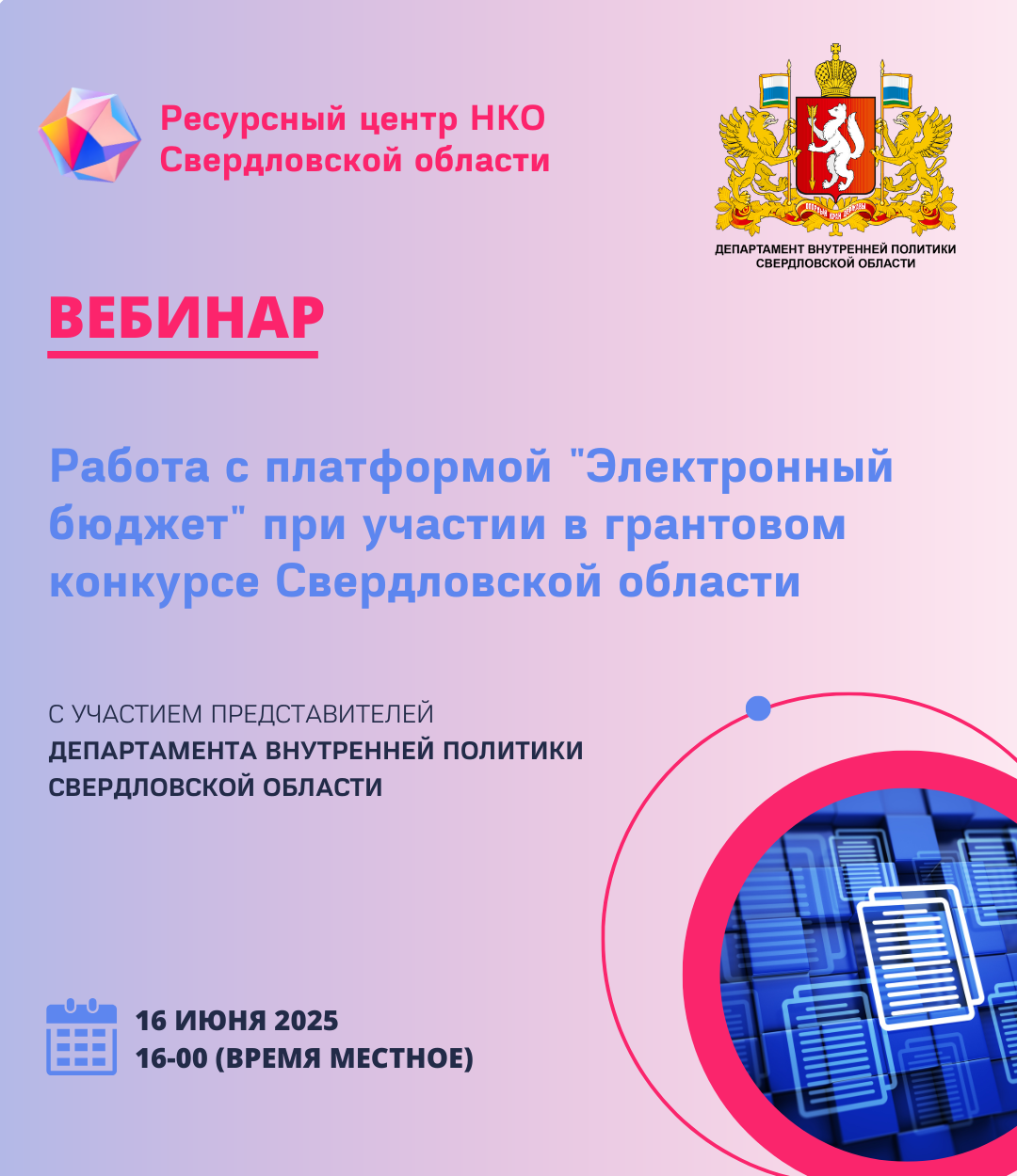 Региональный ресурсный центр НКО Свердловской области проводит открытый вебинар "Работа с платформой "Электронный бюджет" при участии в грантовом конкурсе Свердловской области".